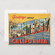 Dies ist ein klassisches Postkartendesign im Vintagen Stil mit dem Satz "Grüße aus Monterey, Kalifornien". Die großen, stilisierten Briefe von MONTEREY enthalten jeweils eine einzigartige Szene aus der Stadt, einschließlich des malerischen Hafens, der Gebäude am Ufer und der Palmen. Das Design strahlt ein nostalgisches Ambiente aus, das sich durch seine Retro-Farbpalette und den kühlen Schriftart auszeichnet. Es eignet sich perfekt für Produkte wie Postkarten, Plakate und T - Shirt für alle, die die uralte Reisekunst oder die wunderschöne Küstenstadt Monterey Lieben.