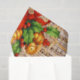 Ein wunderschönes, festliches Weihnachtspapier mit einem Vintagen Notenmuster mit Weihnachtsliedern. Es gibt auch goldene Glocken mit heiligen und roten Bändern, und ein Paar Santa Claus Figuren, die alles ein frohes Weihnachtsfest wünschen.