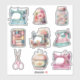 Dieses 9-Sticker-Paket enthält wunderschöne Aquarellbilder für Vintage Nähelemente. Dazu gehören Nähmaschinen, ein Klettverschluss, ein Knopfgefäß, eine Schachtel mit Fässlöffeln, Bügeleisen, Nähscheren und Pinzette.