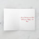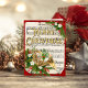 Diese traditionelle Weihnachtskarte bietet eine Vintage Noten-Weihnachtscarolrolle hinter einem französischen Horn, das mit verschiedenen festlichen Blumenmotiven, Beeren und Blume geschmückt ist. Das Weihnachtsdesign hat einen rot-metallischen Hintergrund. Frohe Weihnachten ist in dekorativen goldenen Schriften auf der Vorderseite, und eine Urlaubsbotschaft ist drinnen.