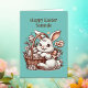 Niedlich Osterhase mit einem Korb voller Schokolade. Vergnügungs-Farbseite auf der Rückseite! Große, personalisierte Osterkarte für Kinder.