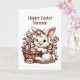 Niedlich Osterhase mit einem Korb voller Schokolade. Vergnügungs-Farbseite auf der Rückseite! Große, personalisierte Osterkarte für Kinder.
