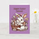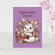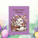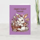 Niedlich Osterhase mit einem Korb voller Schokolade. Vergnügungs-Farbseite auf der Rückseite! Große, personalisierte Osterkarte für Kinder.
