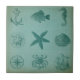 Vintage Ozeanthemacollage mit retro Illustrationen einschließlich einen Anker, Seashells, Fische, Seepferd, Kompass, Schiff, Krabbe, Sanddollar und einen Starfish, alle auf einem Seegrün antiqued Hintergrund.