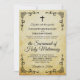 Diese wunderschöne Hochzeitseinladung ist für Paare gedacht, die sich in das Heiligsprechenheiligtum einer Brautmesse oder katholischen Zeremonie einreihen. Das Vintage Pergament-Design zeichnet sich durch verzierte Rollen in den Ecken aus, mit elegantem Schriftzeichen und einem Kreuz oder Kruzifix oben. Ein wunderbarer Weg, um Ihre Freunde und Familie zu einem besonderen Tag einzuladen.