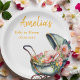Personalisierte Babyduschpapier-Teller mit einem hübschen Vintagen Rollstrophen mit schönen Blume. Diese Teller sind die perfekte Ergänzung zu Ihrem Fest, indem sie eine Touch Vintagen Charmes.