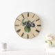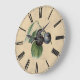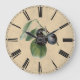 Die Vintage Uhr an der Wand zeigt einen Baumzweig mit einem Trio reifer Pflaumen und Blätter auf antikem Papierhintergrund