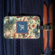 Ein hübsches Hütte-Kernmotiv mit einem Vintagen oder Retro-Fackel mit Monogramm Gepäckanhänger. Mauve, Blau und Bräune mit Schmetterlingen, Pilzen und Blume.