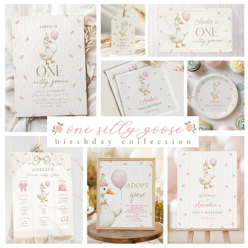 This "ONE Silly Goose" birthday invitation design features a cute goose with a balloon, and a whimsical vintage stripes background with cute pink flowers.