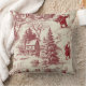 A seamless vintage Christmas toile pattern throw pillow rendered in deep red linework on a cream background, capturing the charm of a winter village scene. The design features Santa Claus carrying gifts, snow-covered cottages, evergreen trees, reindeer, and peaceful snowy paths — all drawn in the elegant, detailed style of classic toile de Jouy. This nostalgic and festive pattern evokes the warmth and tradition of an old-fashioned Christmas.