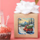 A timeless vintage Christmas illustration featuring a red pickup truck hauling a festive evergreen tree through snowy woods. A nostalgic holiday favorite.