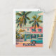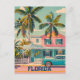 Eine nostalgische und Vintag inspiriert Illustration eines charmanten pastellfarbenen Hauses inmitten großer Palmen in Key West, Florida. Das Haus verfügt über eine geräumige Veranda mit weißen Geländern und eine einladende Haustür. Der Himmel ist klar und sonnig blau, mit flauschigen weißen Wolken. Das Ambiente ist friedlich und entspannend, was einen Retro-Charme hervorruft.