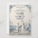 Announce your timeless love story with an elegant, traditional aesthetic featuring a beautiful dusty blue and cream palette for your formal celebration.This design showcases a classical romantic aesthetic centered on a beautifully illustrated proposing couple motif. The visual hierarchy draws the eye from the delicate floral corner borders—composed of roses, daisies, and botanical leaves—down to a man kneeling with a ring before a woman in an elegant gown. The backdrop depicts a classical chapel and cobblestone path set against rolling hills, all rendered in a cream and off-white base with dusty blue accents. The layout balances formal navy blue calligraphy script with clean modern sans-serif numbers and classic serif lettering.This is a flat printed image with a faux 3D bas-relief style and embossed effect, not actual raised material.