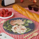Navy Hintergrund in Eclipse blau mit einer großen fetten Kohlensäure Rose im Vintagen Stil. Viktorianische Rose und Blattwerk sind rot und grün. Sehr schön für die Dusche oder den Brauttee.