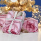 Schöne Geschenkpackung mit Vintagen rosa Rosen auf einem rosa Hintergrund. Ideal für eine Hochzeit oder ein Brautparty.
