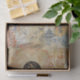 Creative & Unique Decoupage Tissue Paper mit einer Reihe von Texturen, Mustern und Vintagen Illustrationen in lebhaften, gedämpften Farbpaletten. Ideal für Entcoupage, Schrottbuchung und andere Papierboote. Vintages französisches Gewebpapier mit dekorativen Motiven, Figuren & verzierten Blumenmustern in Blau- und Orangetönen auf einem texturierten Kranzhintergrund mit Vintagen Typografien und einem Hauch von Spitze.