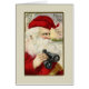 Ein Vintager Weihnachtsmann hält ein Paar Binokulare in der Hand. Gruß: Ein frohe Weihnachten - Er sucht nach dir. Bild einer Vintage Weihnachtspostkarte auf einem benutzerdefinierten hellgraugelben Hintergrund.
