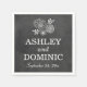 Weiße, maßgeschneiderte Hochzeitsapplikationen mit einem weichen rustikalen schwarzen Bretteruntergrund mit einem strukturierten Look, einem geschnitzten Strauß an Blume und einem Monogramm Braut- und Bräutigam-Namen und Hochzeitsdatum.