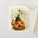 Vintage Wünsche von einer wertvollen kleinen Erinnerung von Halloween vorüber. Dieses ist ein entzückendes Bild einer schwarzen Katze, die hinter einer Kürbislaterne sich versteckt, während eine Maus eine Türklingel auf der Kürbislaterne drückt. Dieses ist ein Muss haben für die Feiertage.