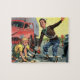 Vintages Bild der Kinder mit einem Schüler, der als Sicherheitspatrol Officer-Schauspiel arbeitet, als Kreuzungswache, der Autos stoppt, um einem Mädchen zu helfen, das ihr Mittagessen auf dem Weg zur Schule am Morgen fallen gelassen hat. Er nimmt einen Apfel in der einen Hand und stoppt den Verkehr mit der anderen. Ein Fahrer im Sattelschlepper wartet geduldig.