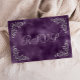 Diese elegante, Vintag inspiriert Hochzeitskartentext-RSVP-Kapselkarte zeigt den Text in einem blasssilbergrauen Drehbuch und Serif-Schriftart, gerahmt durch ein zartes Vintages Silberfolienmotiv in vier Ecken auf einem lila Aquarellhintergrund. Der Titel "UAWG" erscheint auf der einen Seite mit anpassbarem Text auf der anderen Seite.