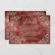 Diese elegante, Vintag inspiriert Hochzeitszittel-Kapselkarte zeigt den Text in einem hellsilbergrauen Drehbuch und Serif-Schriftart, gerahmt durch ein zartes Vintages silbernes Blattmotiv in vier Ecken auf einem cinnamonrostbraunen Aquarellhintergrund. Der Rahmen und der Aquarellhintergrund werden auf der Rückseite wiederholt.
