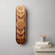 Spiritual Skateboard with wood burning design with five circles and six lines, each line representing different spirituelles symbols from the preColumbian era in M crushed sand painting style. The artwork is created using only shades of brown to fang depth, with an emphasis on sacred geometry patterns, showcasing detailed geometric shapes like stars or moons inside the circles. This depiction highlights intricate details within each circle while maintaining symmetry throughout the piece