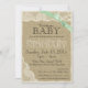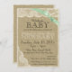 Elfenbeinspitze mit einem weichen grünen Bogen für eine Vintage Babydusche. Alle Teile dieser Einladung sind gedruckt, kein richtiger Bogen oder Einbruch ist angebracht.