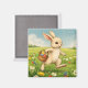 Celebrate Easter holiday with this charming super adorable Greeting Card featuring a joyful white bunny hops through a sun-drenched meadow bursting with wildflowers — daisies, tulips, bluebells, and dandelions — while carrying a woven basket filled with colorful, patterned Easter eggs.