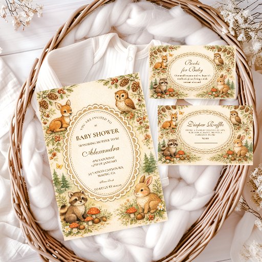 This charming woodland baby shower design features adorable forest animals gathered around a delicate vintage frame, creating a warm storybook scene perfect for celebrating a little one on the way. Sweet illustrations of a bunny, raccoon, squirrel, and owl are surrounded by tiny mushrooms, pinecones, wildflowers, and soft woodland greenery. The warm neutral palette and gentle watercolor style give the design a cozy, nostalgic nursery feel inspired by classic children’s book illustrations. Perfect for nature-themed baby showers, woodland celebrations, or rustic forest gatherings.