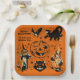 These square paper plates are perfect for your Halloween party. They feature an assortment of vintage style graphics with a witch, black cats, a jack-o-lantern pumpkin, a bat and lots of stars in black cream and orange against an orange background. These plates are ready to be personalized with your own Heading in bold print lettering and your own subtitle in script lettering.