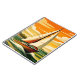 A stylized vintage illustration of a sailboat gliding across rolling ocean waves under a glowing orange sunset sky. Bold geometric shapes, warm tones, and textured gradients evoke a retro travel poster aesthetic. The crisp white sails contrast beautifully with the deep red hull and green-blue sea, creating a sense of motion and tranquility. Perfect for ocean lovers, sailing enthusiasts, and fans of nostalgic coastal art.