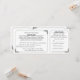 Diese gedruckte Hochzeitseinladung im Stil eines Vintagen Tickets in Schwarz/Weiß enthält auch eine abnehmbare UAWG-Antwortkarte. Einfache runde Rahmen mit abgerundeten Rahmen sind mit verzierten, Vintagen dekorativen Blattrollen versehen. Die Namen der Braut und des Bräutigams sowie die UAWG werden ebenfalls mit dekorativen Rollstuhlarbeiten hervorgehoben. Auf der Rückseite, die Rücksendeadresse kann der UAWG und weitere Einzelheiten der Hochzeit auf die Einladung Portion hinzugefügt werden. Die Schnittlinie für die Antwortkarte wird auf der Rückseite der Einladung durch eine blassgebrochene Linie und ein Schere-Bild angezeigt.