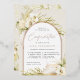 Tropische Chic-Einladungen in einer verführerischen neutralen Farbpalette mit einer Rose mit goldenen Bogengewölbe, die Ihre Kirchenfeier und -feier oder Party-Details trägt, mit blass grünen Aquarellpalmen, beachy Island foliage, weißen Orchideen, boho getrockneten Botanikalen und Pampas Gras.