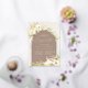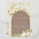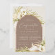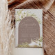 Tropische Chic-Einladungen in einer verführerischen neutralen Farbpalette mit einer Rose mit goldenen Bogengewölbe, die Ihre Kirchenfeier und -feier oder Party-Details trägt, mit blass grünen Aquarellpalmen, beachy Island foliage, weißen Orchideen, boho getrockneten Botanikalen und Pampas Gras.