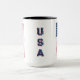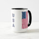 Kick dich zurück und trinke dich stilvoll aus dieser phantastischen Tasse, die auf jeder Seite ein Vintages US-Fahnen-Design mit dem Text "USA" in der Mitte aufweist (auch vertikal - wir waren in einer vertikalen Stimmung!). Der Text ist mehrschichtig schwarz, rot, weiß und blau mit dem Blau in der Vorderseite.