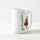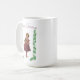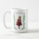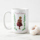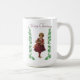 Schöne, Vintage Tasse im Weihnachtsstil mit einem Bild eines niedlichen kleinen Mädchens, das ein Kätzchen in den Händen hält, umgeben von Holly. Frohe Weihnachtsinschrift.