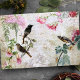 Elegante, Vintage Dekorelemente mit Vögeln, Wisteria, Rose und rosa Blume, gravierten Blätter und antiken Texten auf einem angeschlagenen Pergament-Hintergrund.