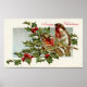 Zwei schöne rote und braune Vögel sitzen nebeneinander auf einem Zweig von heiligen und leicht schneebedeckten Beeren. Gruß: Frohe Weihnachten. Bild von einer Weihnachtskarte aus dem Jahrgang.