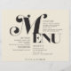 Diese Vintagen Stil 11" x 8,5" Hochzeitsessen Papier Blatt Menüs schwarze Schrift mit einem stilisierten "Menü", in großen schwarzen Buchstaben auf einem cremefarbenen Hintergrund. Auf der Speisekarte stehen Platzhalter für 2 Vorspeisen, 2 Vorspeisen, 2 Nachspeisen und 2 Desserts sowie die Initialen der Hochzeit.