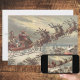 Vintage Abbildung Viktorianisch Frohe Weihnachtsgestaltung mit dem Weihnachtsmann in seinem Schlitten mit seinen Rentieren, die an Heiligabend Spielzeug liefern. Nikolaus fliegt durch den Himmel über eine Stadt mit Häusern im Licht des Mondes. Von Thomas Nast.