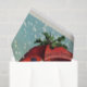 Eine Vintage Weihnachtskutsche voll mit Spielzeug mit einem großen roten Schirm und Horn. Holly und rote Beeren schmücken die Kutsche.