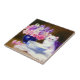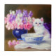 Keramik Tile mit einem schönen weißen Kätzchen mit einem lila Band! Diese flauschigen Posen neben einer blauen Schüssel und einer Vase aus rosa, lila und weißen Blume. Ein wunderbares Geschenk für Katzenliebhaber und Viktorianische Kunstliebhaber!