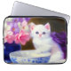 Laptop Sleeve mit einem schönen weißen Kätzchen mit einem lila Band! Diese flauschigen Posen neben einer blauen Schüssel und einer Vase aus rosa, lila und weißen Blume. Ein wunderbares Geschenk für Katzenliebhaber und Viktorianische Kunstliebhaber!
