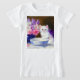 T - Shirt mit einem schönen weißen Kätzchen mit einem lila Band! Diese flauschigen Posen neben einer blauen Schüssel und einer Vase aus rosa, lila und weißen Blume. Ein wunderbares Geschenk für Katzenliebhaber und Viktorianische Kunstliebhaber!