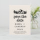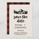 Diese Vintage Wildnis kariert Save the Date Karte ist ideal für eine Hochzeit in den Bergen. Das inspirierte Gestaltungskonzept der Felsberge besticht durch eine handgezeichnete Berg-, See- und Waldszene mit Büffel-kariertem Rücken für ein gemütliches Hüttengefühl.