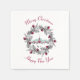 Papierservietten mit digitalem Bild einer bemalten Abbildung einer roten Kirche und eines steilen Flusses. Ein heller Weihnachtsstar, der über der Decke leuchtet. Familien vor dem Haus, die für einen Gottesdienst anreisen. Winterschnee bedeckt den Boden und Erholungen auf niedlichen Buschkiefern. Ein rot-grauer Weihnachtskranz umgibt das Bild. Frohe Weihnachten und Glück Neues Jahr geschrieben in gekrümmten Text rund um das Bild.