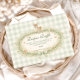 A soft woodland baby shower design featuring a delicate watercolor fawn standing above a floral forest wreath. Gentle greenery, tiny mushrooms, and wildflowers surround the center, while a soft sage gingham background and ribbon bow add a cozy countryside nursery feel. The vintage storybook illustration style and muted woodland palette create an elegant and whimsical design perfect for a nature-inspired celebration welcoming a new baby.