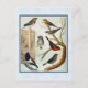 Postkarte mit digital gesäubertem und verbessertem Vintage-Bild von männlichen und weiblichen Zebra Finches, männlichen und weiblichen afrikanischen Zebra-Wachs, männlichen und weiblichen Strawberry Finches und einem dreistöckigen Finch. Farbige Darstellung der Naturgeschichte von W. Rutledge aus dem Illustrierten Kanarischen und anderen Käfigvögeln, 1878. Gerahmt und mit einer hellblauen Pergamentstruktur unterlegt.