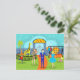Der Vintage Zoo Postcard zeigt eine klassische Fernsehfamilie aus den 50er Jahren auf einem Wochenendausflug. Dieses moderne, minimalistische Kunstdesign aus der Mitte des Jahrhunderts besticht durch einen Cartoon, der von einem perfekten Tag im Zoo zeichne. Ja, es ist ein schöner Tag für einen Familienausflug und Sie sind an den richtigen Ort gekommen. Treten Sie durch das schmiedeeiserne Tor, unter dem gelben Schild mit roter Schrift, auf der steht: "ZOO". Im Inneren sieht man einen orangefarbenen, steinernen Weg, der von üppigem, grünem Gras flankiert wird. In einem großen Käfig wird man den majestätischen Löwen bemerken. Dieser orangefarbene und gelbe König des Dschungels behalte seine Augen auf ein hübsches, blondes Mädchen in einem rosa Kleid, das zufällig seine Augen auf ihn behalte. Auf der gegenüberliegenden Seite der Promenade kann man die imposante, gelbe und braune Giraffe in einem runden Gehege nicht verpassen. Er ist auf Augenhöhe mit der schwingenden Palme im Hintergrund. Ein junges, junges Zeltlager mit einem hellen, roten Shirt und blauen Jeans hat es eilig, irgendwo hinzukommen. Oh, mein! Es sieht so aus, als ob er eine Latte zu einem Zookeeper macht. Der Halter des Zoos ist angemessen gekleidet in Khaki Shorts, Shirt und Hut. Was hält er da? Ein Affe! Und was hält das Geld? Eine Banane! Leute, es ist nicht besser als das! Auf dem Weg stehend sehen wir Vater. Moment! Ich bin froh zu sehen, dass er weiß, dass es sich lohnt, auch an einem freien Tag vom Büro aus dein Bestes auszusehen. Er trägt einen blauen Anzug, hellblaues Shirt und rote Krawatte. Vater gibt drei Ballons in Orange-, Blau- und Rottönen an die Mama ab. Die Mama trägt ein blaues Kleid mit einem formpassenden Körper und einem aufgeblasenen Rock. Ihre flippige, blonde Frisur wird am meisten. Der Himmel ist in Aquatönen, aquamarin und blau gehalten und mit magischen, weißen Sternen gefüllt. Genau wie der Zoo selbst macht dieses Design Spaß für die ganze Familie und ist perfekt für Kinder jeden Alters.